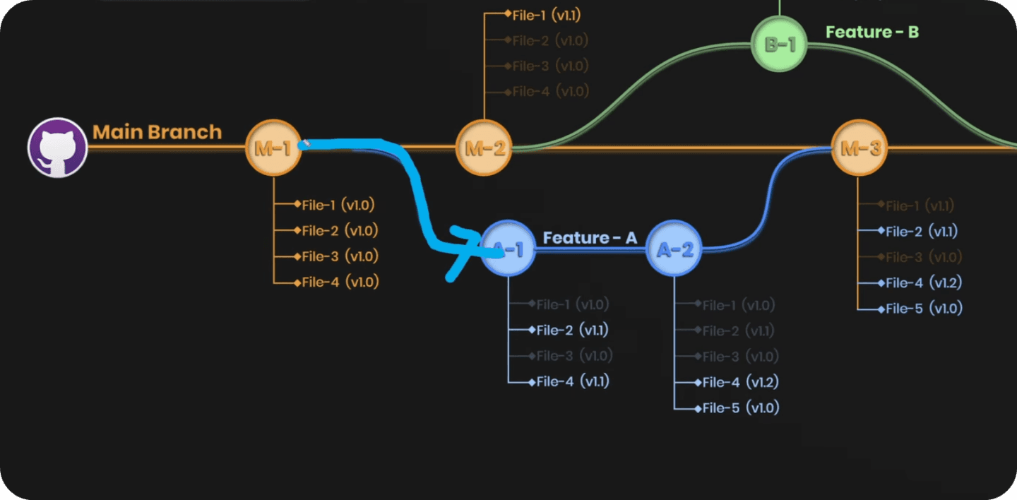 Let's say you have 2 states and they have different new files. If you're going to switch between branches and look at your folder structure, you'll notice that files disapper/change depending on the state. If File-A only exists on the first branch it will disappear when you go to the second branch. And then re-appear when you go back.