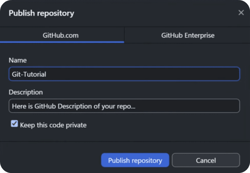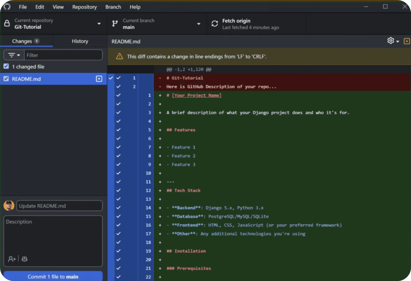 Once you're ready to create a commit, write Commit Message and optional Description that will be shown in Commit History inside your repository.