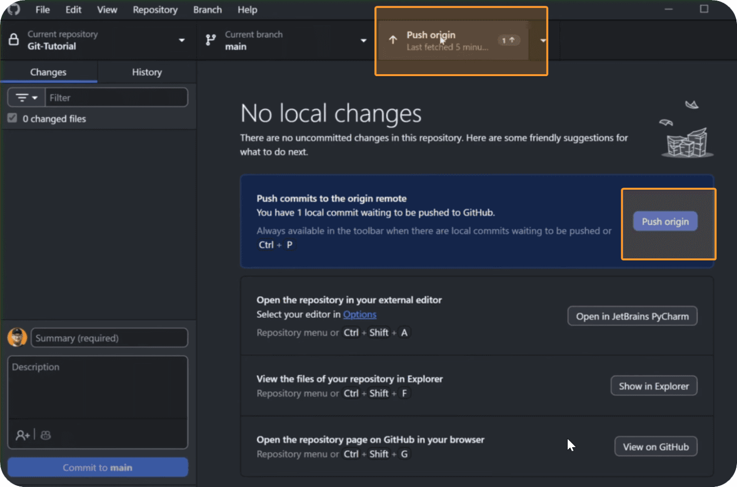 After you've made one/multiple commits, don't forget to click on Push origin to send your changes to your GitHub Repository.