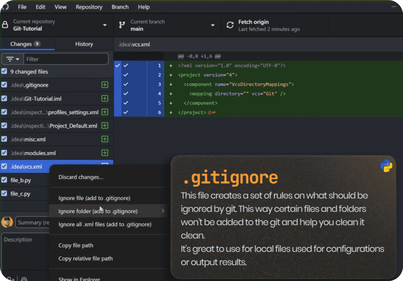 For example, in this lesson I've excluded .idea folder which is a pyCharm Configurations. There's zero point adding it to Git, so it's best to exclude it right away.