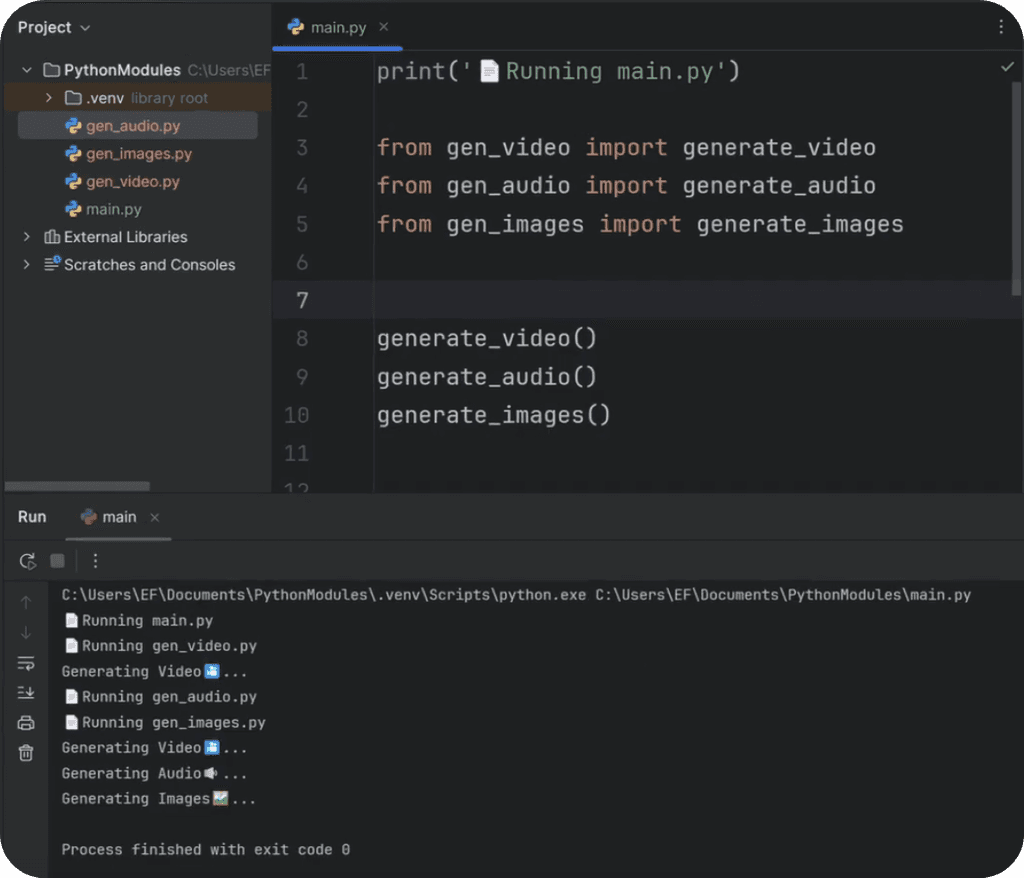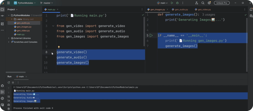 So let's go back to our new modules (gen_images.py, gen_audio.py, gen_video.py) and add this special statement so we only print if we execute code from inside these files.