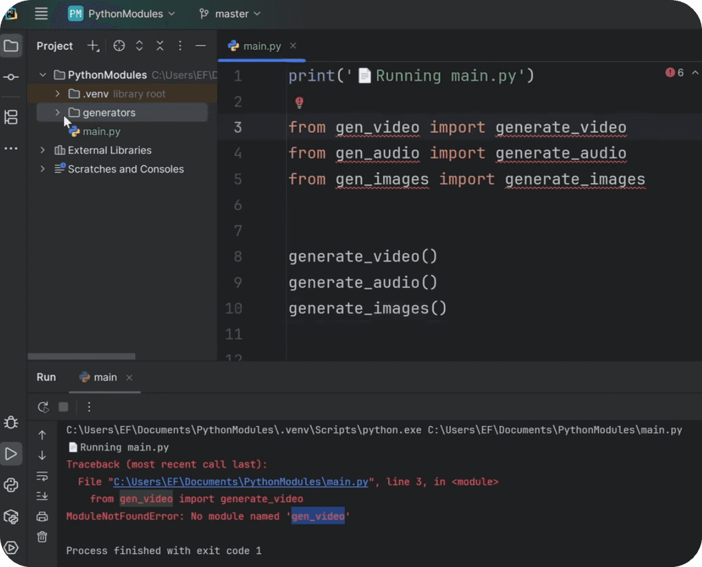 Then if you try to execute your main.py file you'll get an error because it can't fine the modules in the previous place.